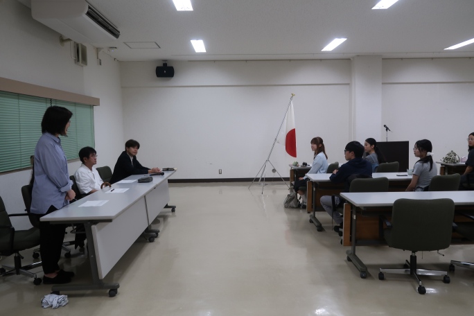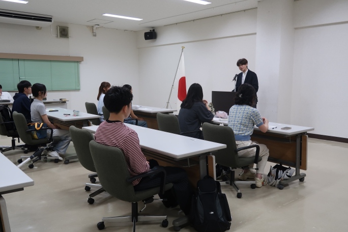 開講式ではグローバルラーニングセンター長の代読による、理事・副学長(国際交流・社会連携担当)からの歓迎のことばの後、留学生担当教員や指導教員の紹介が行われました。出席した留学生は緊張した面持ちで、自己紹介し福岡教育大学で学ぶことの抱負を語りました。開講式終了後のオリエンテーションでは、留学生担当教員から受講する授業について説明を受けた後、令和8年3月から1年間協定校へ派遣留学する予定の本学学生から福岡県内の観光地や近隣のお勧めのスポットなどの紹介がありました。