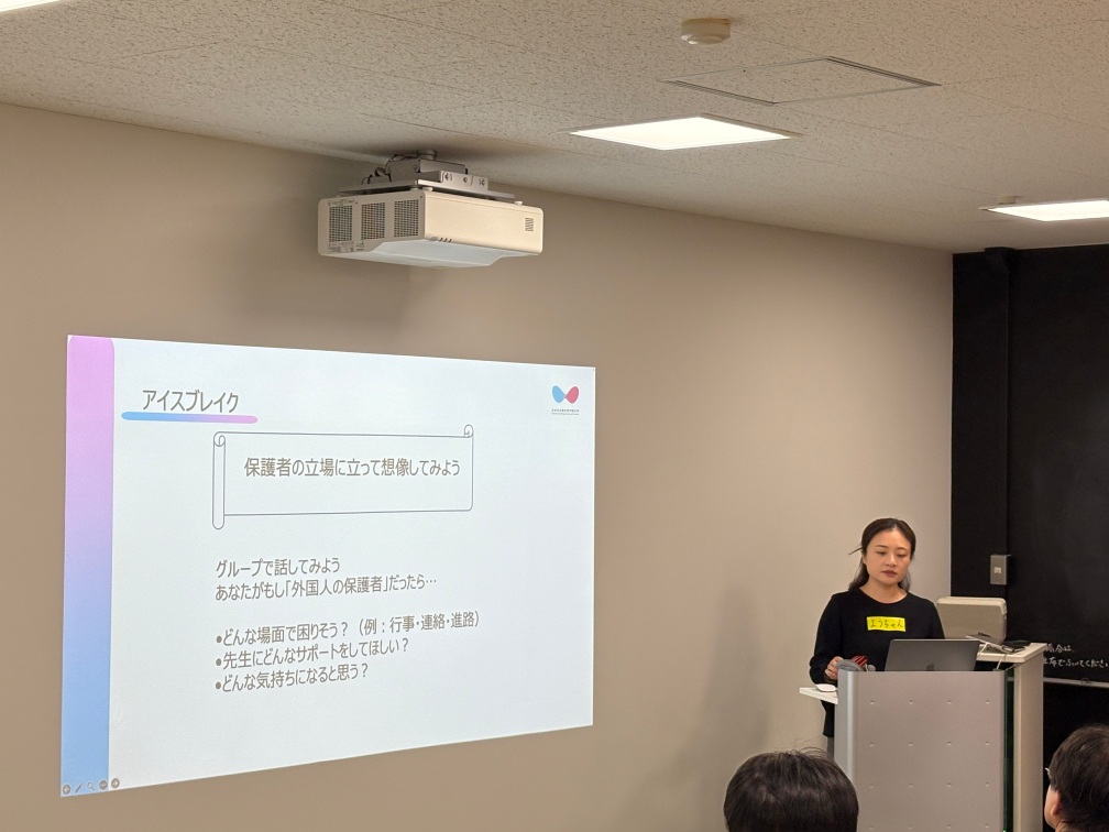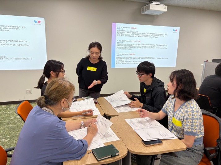外国ルーツをもつ人々は母語・文化的背景・習慣が多様であること、学校からのお知らせや連絡を理解しにくいことなどの課題があることについて説明があり、どのように橋渡しをしていくことが必要かグループワーク等を通じ、考え、ディスカッションを行いました。対面で参加していた2グループは、グループワークで話した内容等をそれぞれ発表しました。