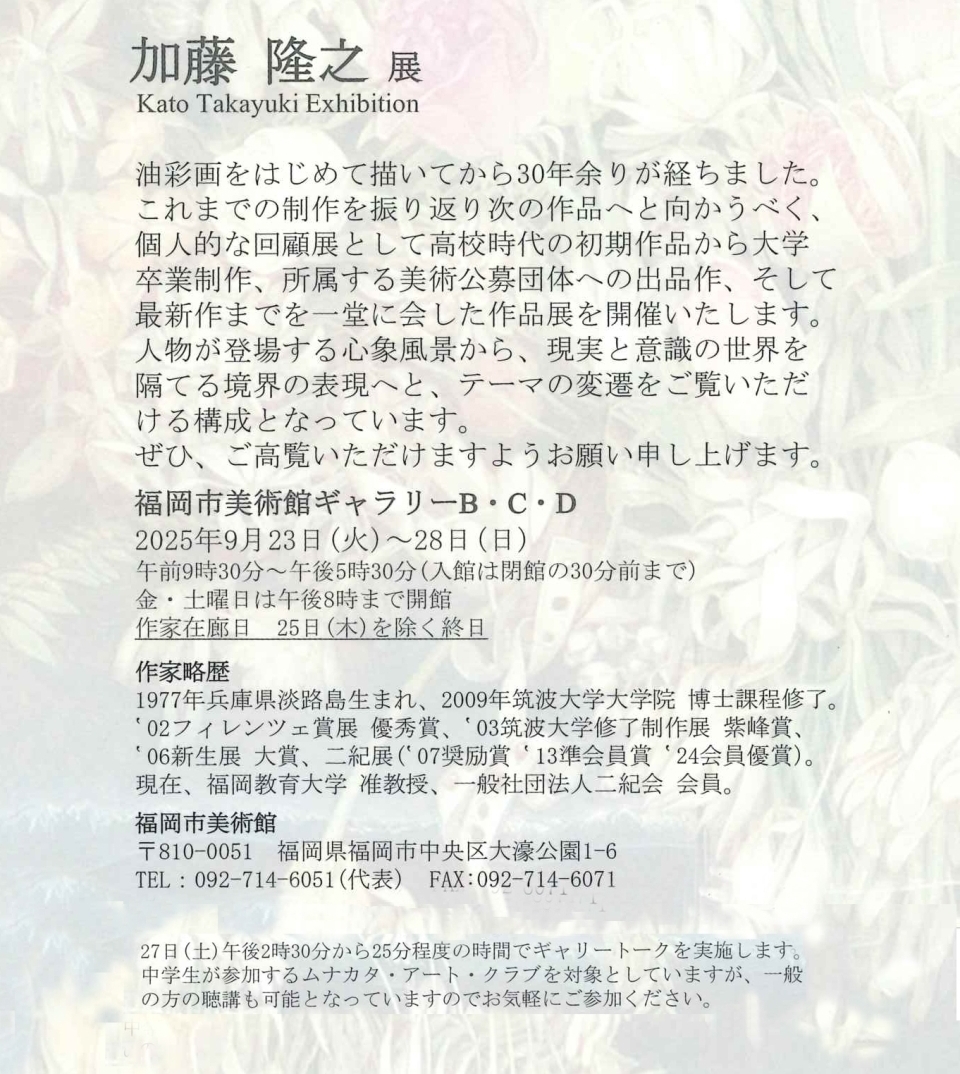 美術教育研究ユニット 加藤 隆之 准教授が、油絵作品による個展を9月23日(火)から9月28日(日)まで、福岡市美術館のギャラリーB・C・Dで開催します。