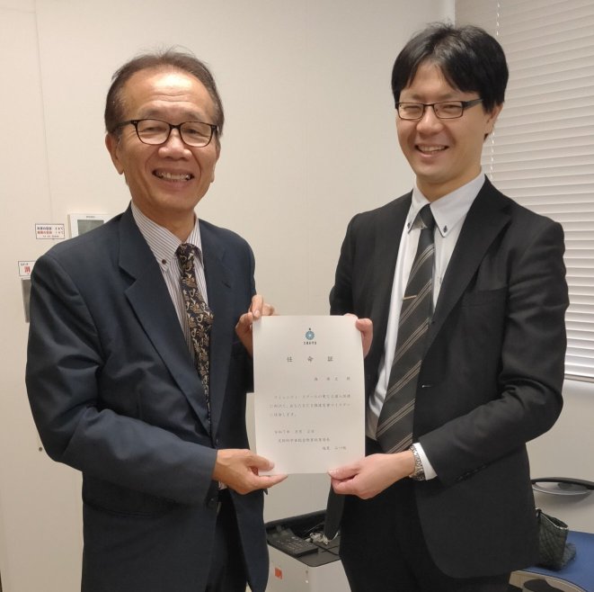 山本 悟文部科学省総合教育政策局地域学習推進課地域学校協働推進室長(写真右)より任命証を授与される森教授(写真左)