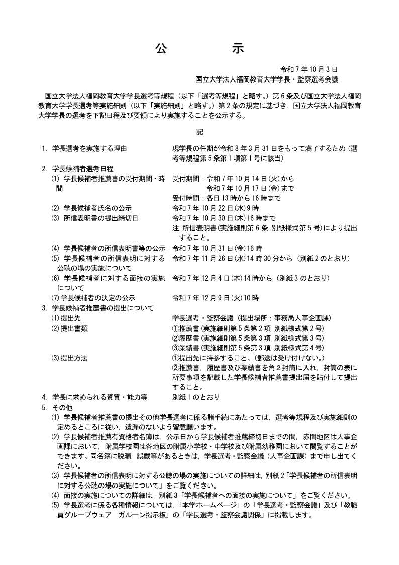 学長候補者の所信表明書等の公示(令和7年10月31日)