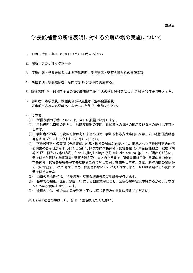 別紙2 学長候補者の所信表明に対する公聴の場の実施について(JPEG形式)(令和7年10月3日)