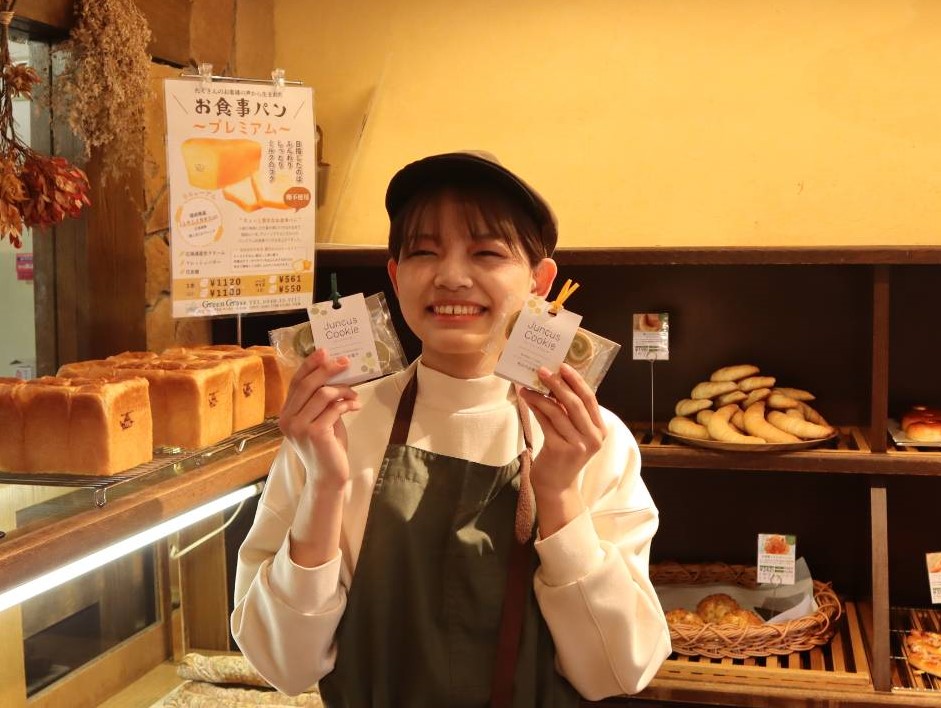 この度、本学の学生が考案・開発したイグサ粉末入りのクッキー『Juncus Cookie』がグローバルアリーナGreen Grassベーカリーで実用化され、販売されることとなりました。
