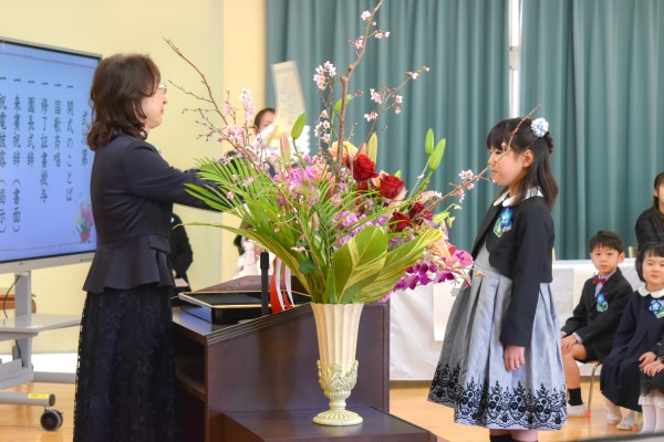 園長式辞に「附属幼稚園で育てた3つの種(あいさつの種・なかよしの種・がんばりの種)を毎日、小学校にも持って行きましょう。そして、自分で育てて、すてきな花を咲かせましょう」とありました。