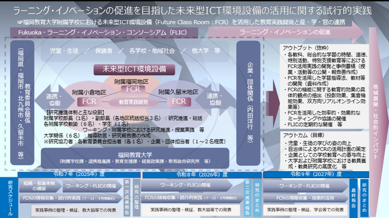 FCRは、福岡教育大学附属の3地区(附属福岡地区、附属小倉地区、附属久留米地区)に実装され、令和7年度から各地区での試行的実践が行われています。フレキシブルな空間とICTを融合した未来の教室として新たな学びのすがたを創出し、大型&マルチスクリーンと高集音機能により、没入感のある体験や教科の特性に応じた効果的な学習、遠隔地(国内外)のFCR間の接続による双方向リアルオンライン授業等も可能となります。