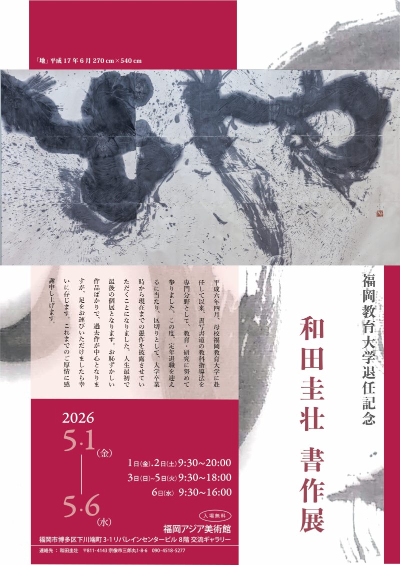 平成6年から本学にて教鞭を執られた和田 圭壮 元教授による、書作展を5月1日(金)から5月6日(水)まで、福岡アジア美術館8階の交流ギャラリーで開催します。