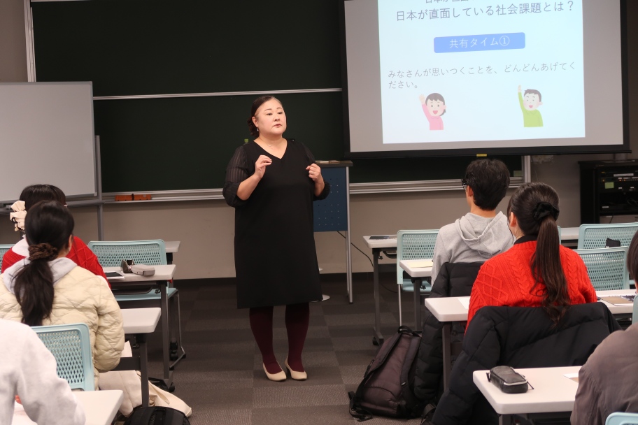 日本が直面している社会課題について参加者に尋ねる講師