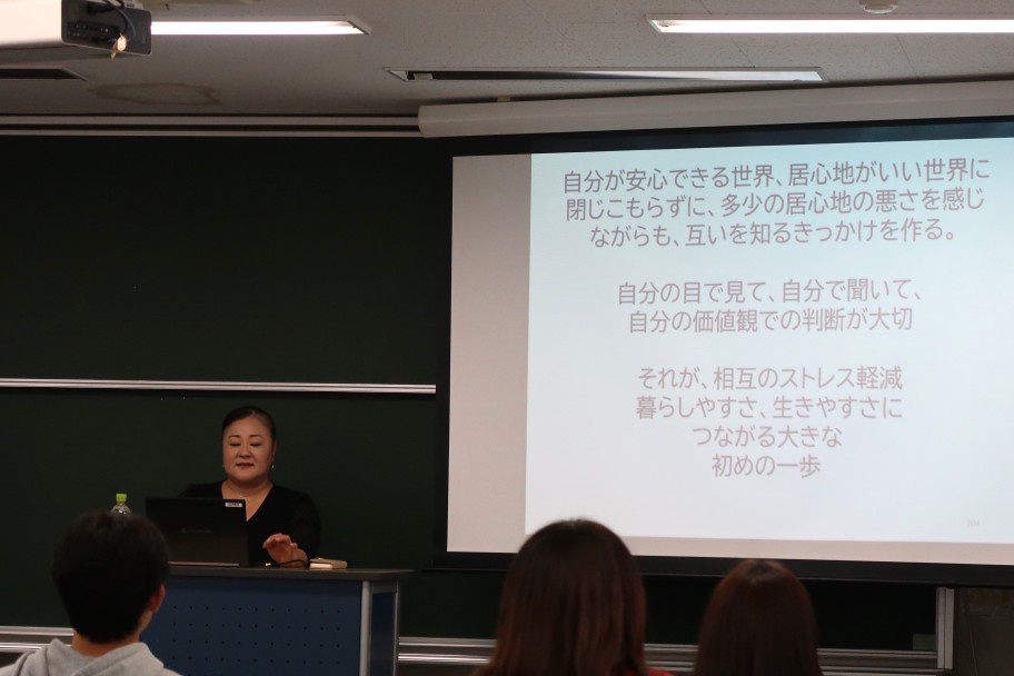 後半では、多文化共生に関する取り組みや日本の現状について解説が行われました。最後に「自分たちが考える多文化共生とは何か」をテーマに、議論が展開されました。学生からは「海外の文化に興味を持つ」「互いの国や人、文化を尊重する」など、前向きな意見が寄せられました。