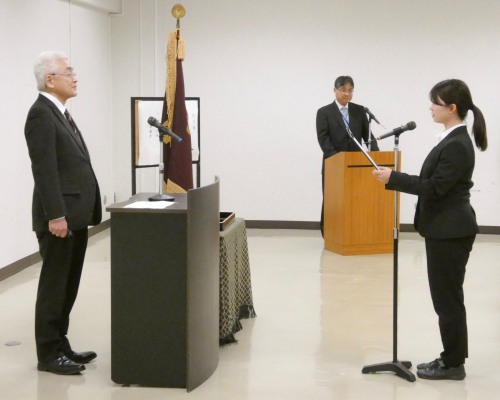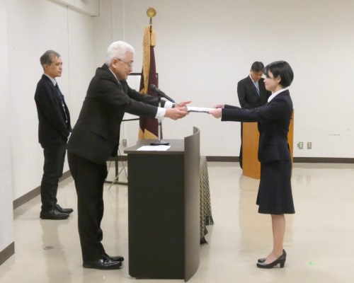 また、門司後援会会長からも、「教育実習のなかで肌で感じた授業作りの奥深さと難しさ、子どもたちとの学びを忘れることなく大学生活を送ってほしいと思います。幕末の教育者である吉田松陰が実践した「人を残す教育」は目指すべき教師像の原点であり、なかでも①児童生徒への深い愛情、②組織の一員としての自覚を大切にしていただきたい。今回の受賞を大きな自信と誇りに変え、さらに自分自身を磨き続けてください。情熱を持って教育現場に飛び込んでくる日を心待ちにしています。」と祝辞がありました。