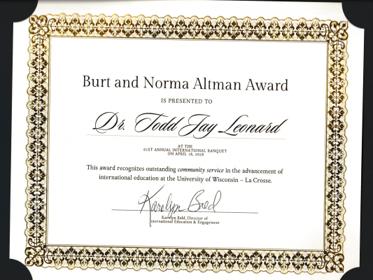 レオナルド教授は長年にわたり、短期研修をウィスコンシン州立大学ラクロス校にて行い、ウィスコンシン大学ラクロス校及びラクロス地区での国際教育において多大なる貢献をしたことを賞してウィスコンシン大学ラクロス校よりBurt and Norma Altman Awardを受賞されることとなりました。